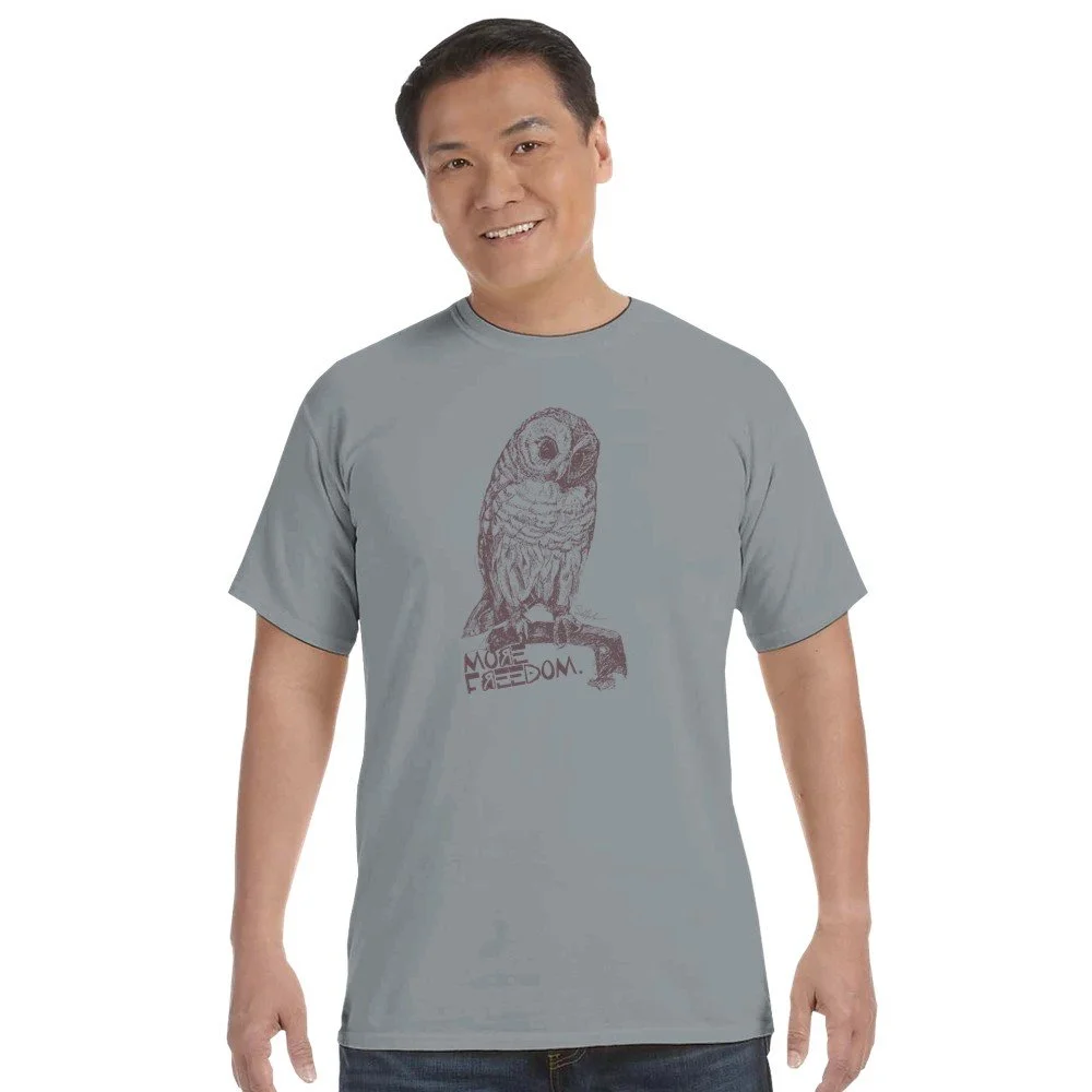 Embrace wisdom and freedom with this unique "Owl" t-shirt, featuring an original on-location line drawing by artist Sarah Hascher. The striking owl, symbolizing wisdom, is paired with the empowering phrase "more freedom" in a bold grunge font. Crafted from ultra-soft, pre-shrunk, and garment-dyed 100% US-grown ring-spun cotton, this tee offers a comfortable vintage feel with minimal shrinkage. Built for lasting wear, it boasts a twill-taped neck and shoulders, double-needle stitching on sleeves and hem, and a durable 1" ribbed collar. Perfect for art lovers, free spirits, and anyone seeking a stylish, meaningful addition to their wardrobe. Add this conversation-starting tee to your collection today!